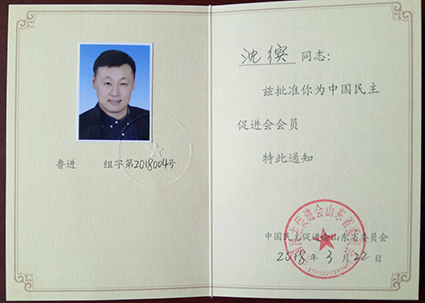 公司董事長沈繽同志于20181申請加入中國民主促進(jìn)會,3月份中國民主促進(jìn)會山東省委員會正式批準(zhǔn)沈繽同志加入中國民主促進(jìn)會。