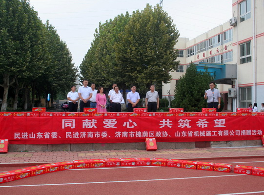 2018年9月13日下午16:00時(shí)許,由槐蔭區(qū)政協(xié)、民進(jìn)山東省委、民進(jìn)濟(jì)南市委、山東省機(jī)械施工有限公司聯(lián)合主辦,山東省機(jī)械施工有限公司承辦的“同獻(xiàn)愛(ài)心,共筑希望”的愛(ài)心捐贈(zèng)活動(dòng),在濟(jì)南市特殊教育中心隆重舉行,以體現(xiàn)社會(huì)各界人士對(duì)殘障少年兒童的關(guān)愛(ài)及企業(yè)的社會(huì)責(zé)任。參加此次捐贈(zèng)活動(dòng)的領(lǐng)導(dǎo)有市人大常委、民進(jìn)濟(jì)南市委副主委劉海萍、槐蔭區(qū)政協(xié)主席徐賓、民進(jìn)山東省委組織部部長(zhǎng)姜軍鋒、民進(jìn)濟(jì)南市委辦公室主任王洪偉、山東省機(jī)械施工有限公司董事長(zhǎng)沈繽、山東機(jī)施公司財(cái)務(wù)總監(jiān)徐占全、副總經(jīng)理?xiàng)蠲鳌⒅緞、工?huì)主席賈學(xué)偉。濟(jì)南特殊教育中心書(shū)記韓坤及在校師生共300余人參加了此次捐贈(zèng)活動(dòng)。
