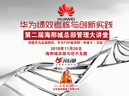 2018年11月26日,公司組織公司管理骨干在海那城總部,參加第二屆海那大講堂——華為績效考核與創(chuàng)新實(shí)踐現(xiàn)場講授活動,主講人:華為高級顧問、TOP講師李俊才先生。