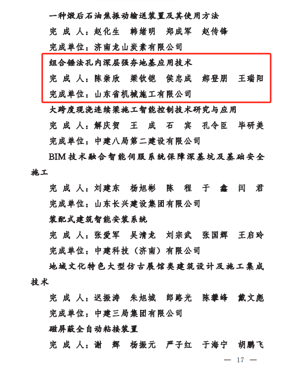 11月29日,濟(jì)南市總工會公布2023年度泉城職工全員創(chuàng)新創(chuàng)效競賽結(jié)果,我公司研發(fā)的“組合錘法孔內(nèi)深層強(qiáng)夯地基應(yīng)用技術(shù)”被評為濟(jì)南市職工優(yōu)秀技術(shù)創(chuàng)新成果二等獎(jiǎng)。