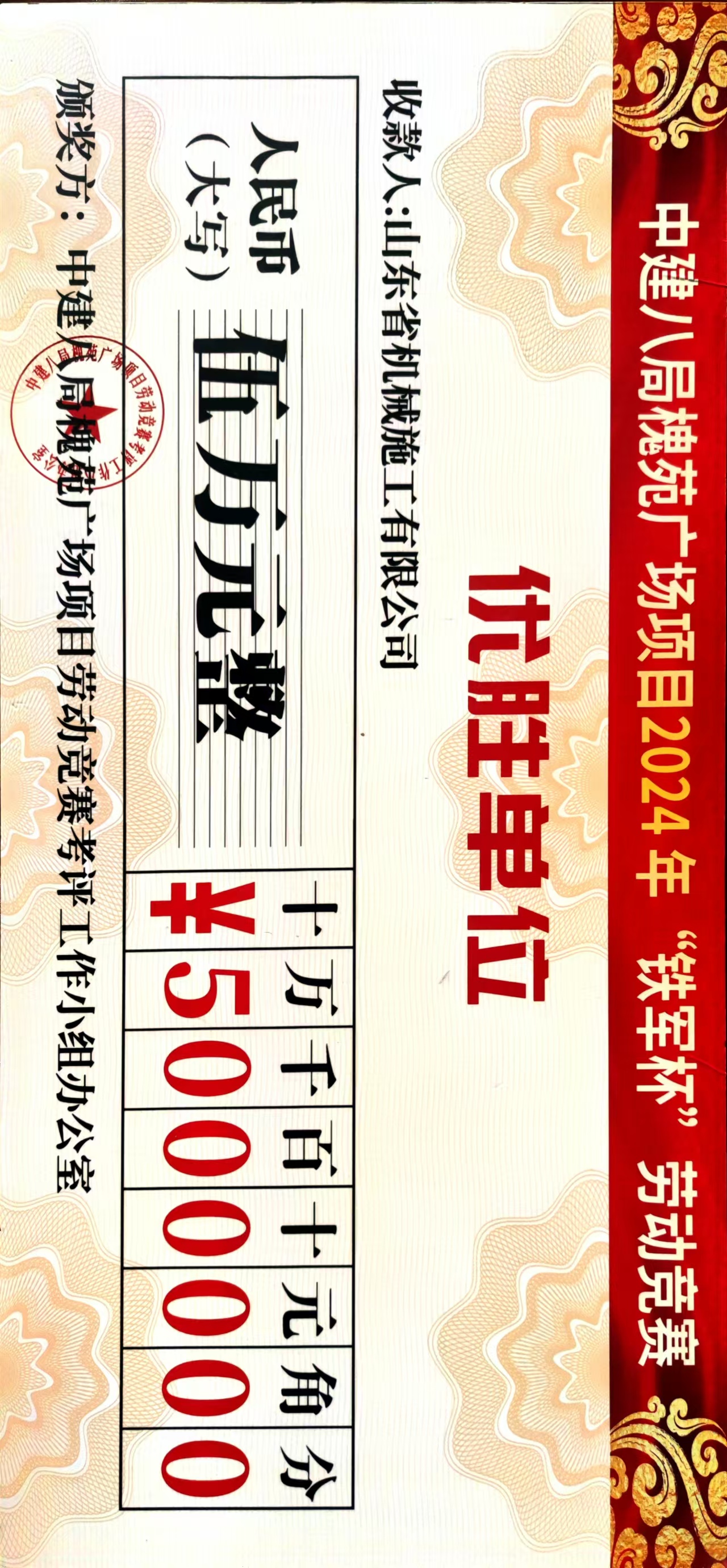 1月13日,中建八局槐蔭廣場(chǎng)建設(shè)項(xiàng)目,2024年“鐵軍杯”勞動(dòng)競(jìng)賽總結(jié)表彰會(huì)暨2025年“鐵軍杯”勞動(dòng)競(jìng)賽啟動(dòng)儀式隆重召開。山東省機(jī)械施工有限公司榮獲“優(yōu)勝單位”稱號(hào)并獲得現(xiàn)金獎(jiǎng)勵(lì)5萬元;第五分公司王海波、郝韶晨被授予“先進(jìn)個(gè)人”稱號(hào)。